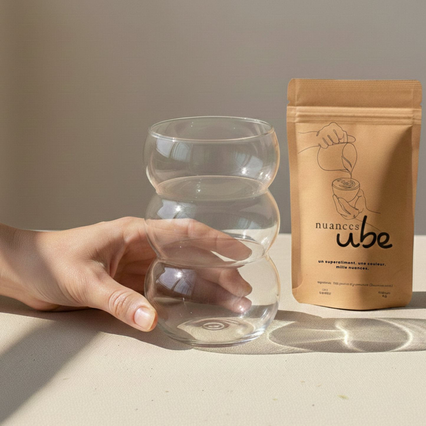 Verre soufflé aux courbes arrondies, conçu pour sublimer les boissons rituelles telles que l'ube latte ou le matcha latte. Convient pour boissons chaudes et froides.