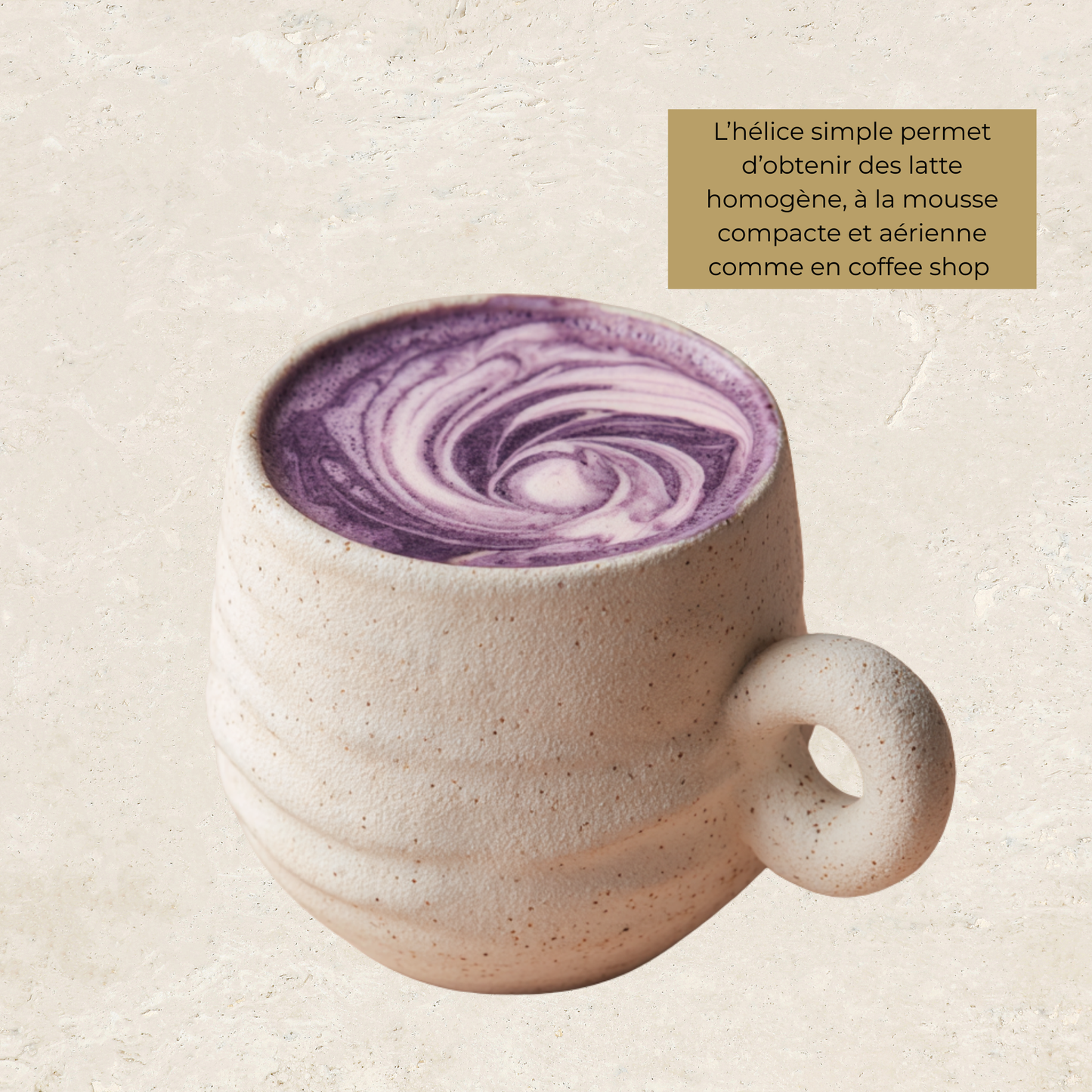 - L'embout à hélice simple permet d'obtenir en quelques secondes un latte, nuancé, parfaitement homogène, avec une mousse compacte et aérienne comme en coffee shop.
